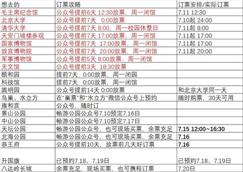 引用楼主的发言:接下来的重中之重就是预定各个景点的门票了。我整理了个这样的表格,算好预约的时间,逐个抢票。表中标红色的都是抢票难度比较高的,必要时要请亲朋好友一起帮忙约,比如故宫博物院、北大和清华