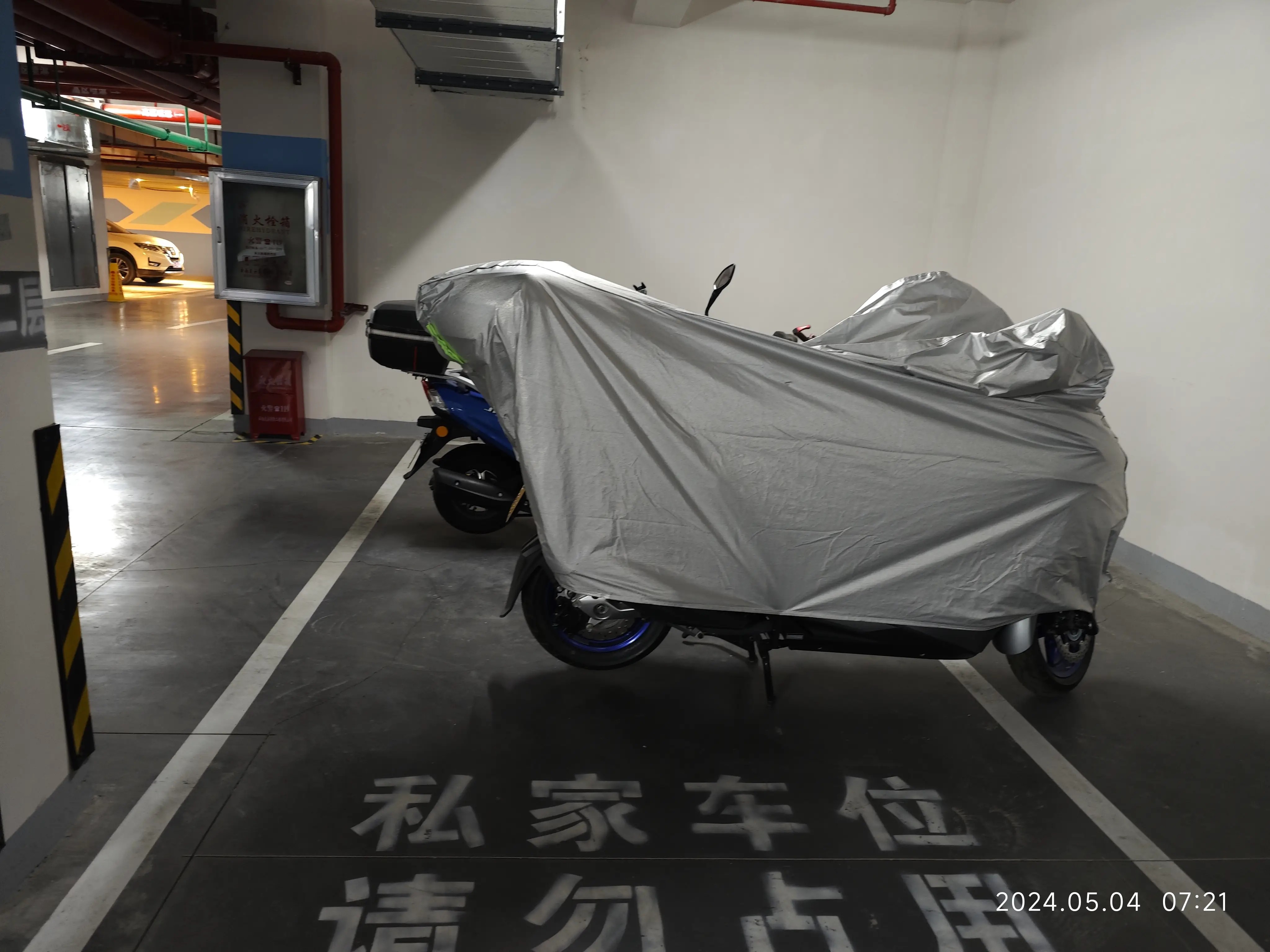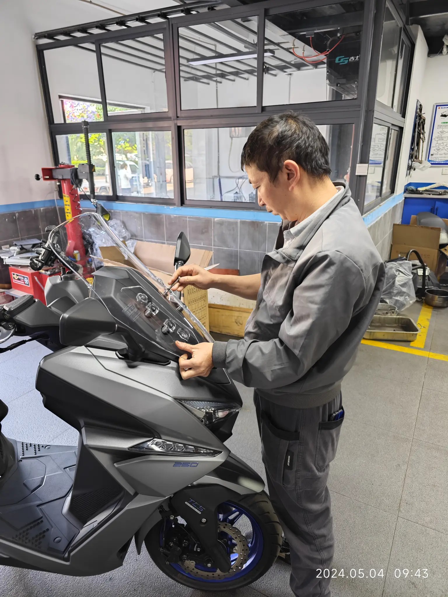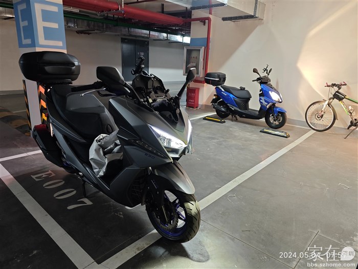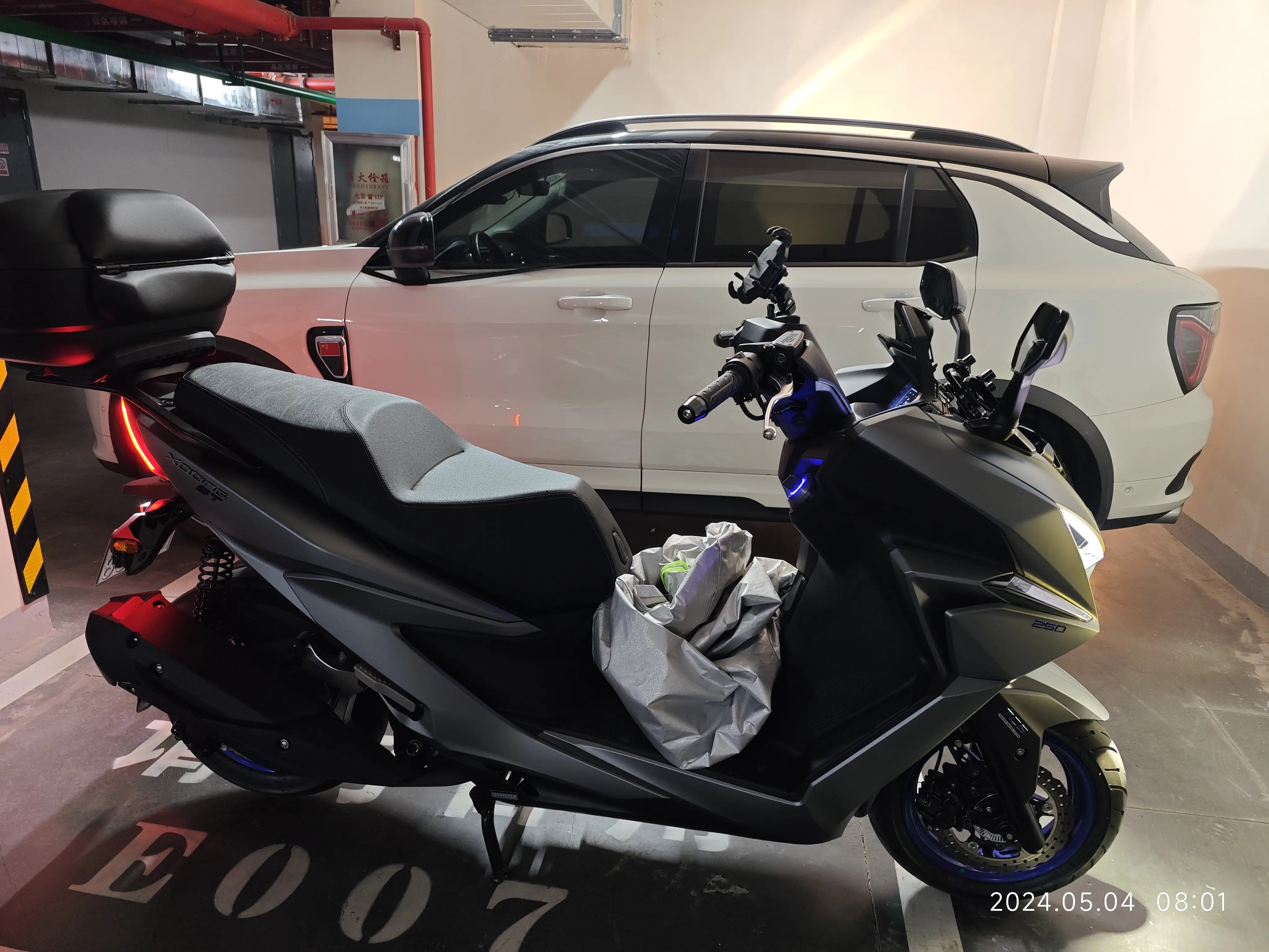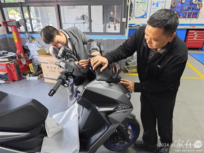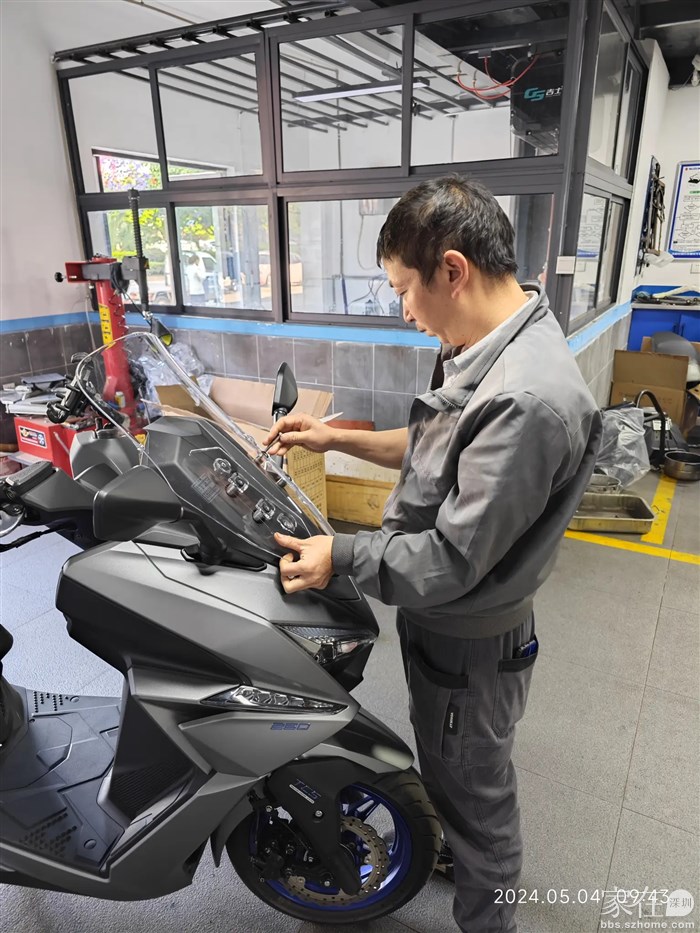 要先将这个新摩托车的电池装好,才能够打开车头锁挪车,才能腾出空间放我的汽车,还好一切都顺利,电池装好以后秒着车。