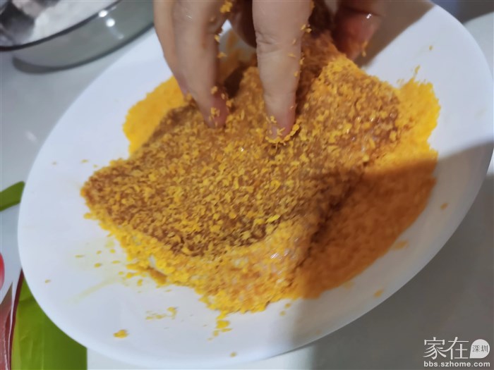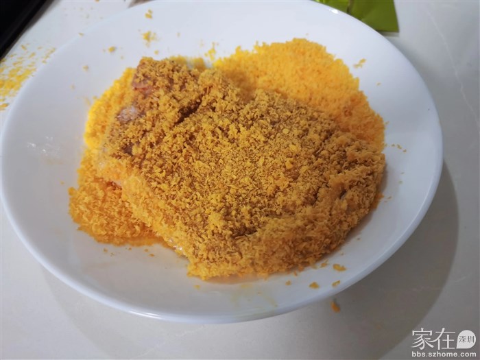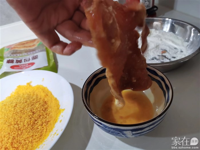 3.准备一盆低筋面粉、一盆鸡蛋液、一盆面包糠,!!重点来了,裹面粉的时候牢牢按压,充分裹满,接着不要马上裹鸡蛋,静置5分钟让面粉都融进去!接着裹鸡蛋液,裹完也静置5分钟,让鸡蛋液充分吸收,然后再裹上面包糠!这样能很好的锁住水分,炸出来外脆里嫩