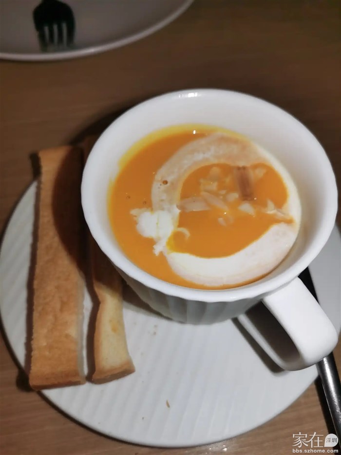 最后,我还品尝了农场杏仁南瓜汤和玉米汤,款汤品都让我感到非常满足