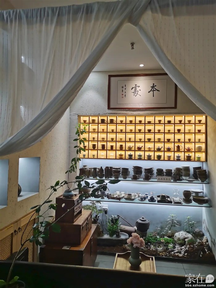 环境非常好,现代中式,柔和暖光,暖灰墙,摆放绿植。播放宁静的音乐。