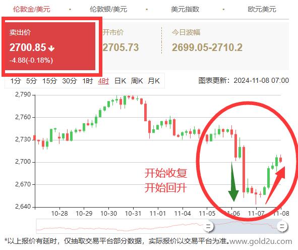 昨天才说受到美国大选特朗普影响,打压一下金价属于正常,今天黄金居然又暴涨了,没想到金价这么快就开始回升了。昨日受到美国大选特朗普影响,黄金跌穿2643美元关口,今日又回到2705美元关口,幅度如此之大,实在是峰回路转,没想到这么快就回升了。
