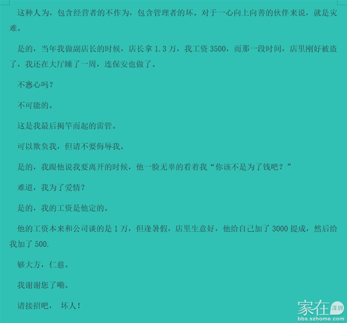总共4000来字,我先是用2000来字回顾了做前台时的快乐与满足,然后话锋一转,说新店长来后的江河日下。