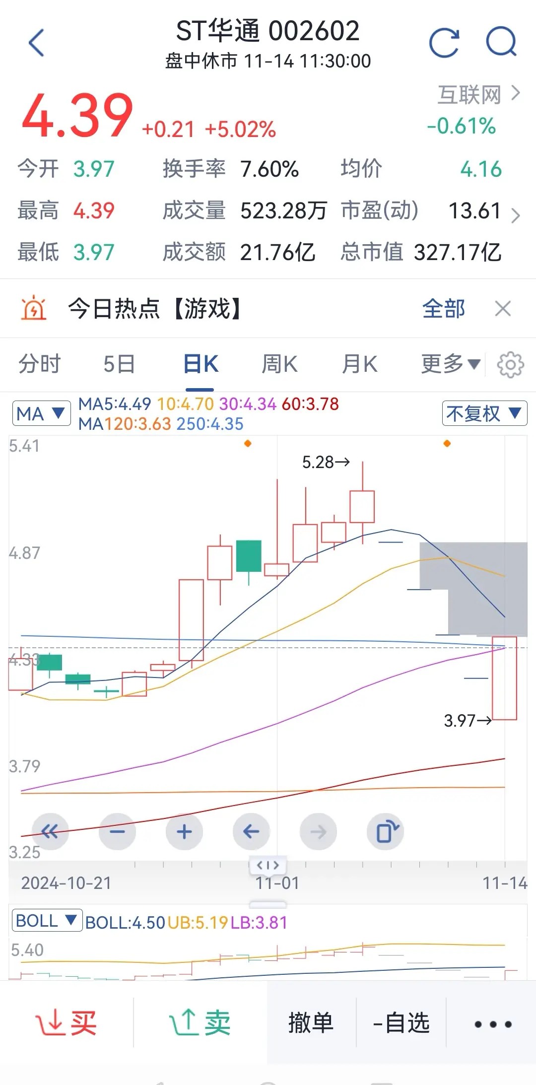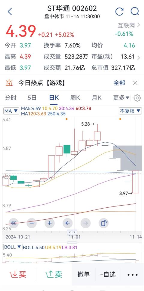 昨天那么好的行情一大早收到券商发来的风险提示,原来我新进不久的一只个股被戴上ST的帽子停牌1天,今天自然是按在地板上一点动弹不得