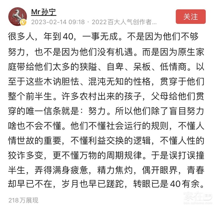 引用68楼楼主的发言:你错了,想当年我本来是保送到我市里重点高中就读的,后来的中考分数我也是比录取的重高分数多了60多分的,唉,那是也是因为家贫没能去读高中而选择了读中专的!话说当年一个学校也只能考几个中专生的!引用65楼弯的缶的发言:楼主,一看题,我以为你研究生或博士后学历,在仕途和商业中选择了后者,然后你老父母一直耿耿于怀,后面一看一个职业中专毕业生,都只能考上职业中专你的成绩也好不到哪去,现在这个公务体系可以说云集了中国最聪 明的人,竟然在纠结为啥不当公务员,不是看不起这学历,而是你这完全是自寻烦恼啊,你能赚这么多钱,不是你能力有多强,只能说你具备一定基本素质,吃苦耐劳,爱好学习,有上进心,最主要是你抓住了机会,享受到了国家实体经济济 发展带来的红利,还有你父母是相当自私的,你从一个底层9死一生爬起来的人,算是相当不容易也相当不错了,不认可你,关心你的不容易,竟然想的是你没有当官,给他脸上增光,搞笑的一家。引用30楼楼主的发言:我就是没听他们的话,再说我父母都是农民,而且是种了一辈子田的农民,一辈子老实巴交的,没有也不会有什么好的想法和视野。