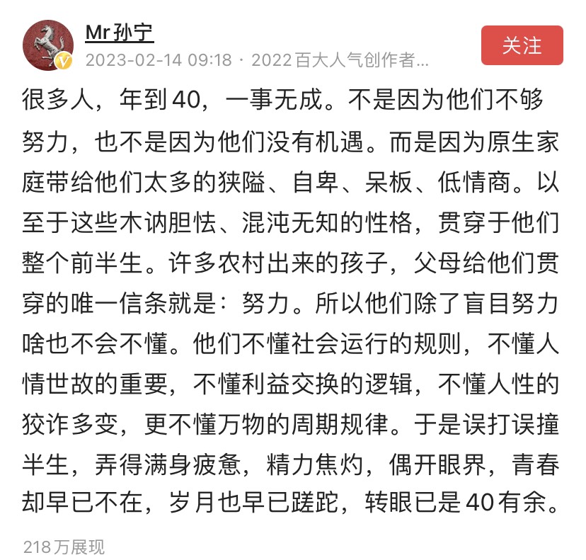 引用eric200407的发言:你说的很对,过好自己就好了!深圳人都懂的。问题是楼主有钱了,骨子里面想显摆(看了之前帖子),衣锦还乡人之常情,但是要付出成本的,比如建栋大别墅,给村里老人红包,捐钱,帮助周围人等等,可是楼主陷入了他有钱,比GWY有钱多了,为啥得不到他父亲认可呢?穷则独善其身,达则兼济天下。你发达了要么低调,要么就对周围的人有帮助才能高调,除了父母,没人真心看到你有钱,除非对别人有帮助。引用春华秋仕的发言:为什么要为周围人解决问题?欠他们吗?官场都是靠权力变现,没被抓到就是0%,被抓到就是100%,看看最近株洲市长阳卫国被抓,连带三个兄弟全进去坐牢,他的父母作何感想?你觉得他周围被帮过的人还会对他感恩戴德吗?只会躲得远远的,人性的薄凉淋漓尽致。