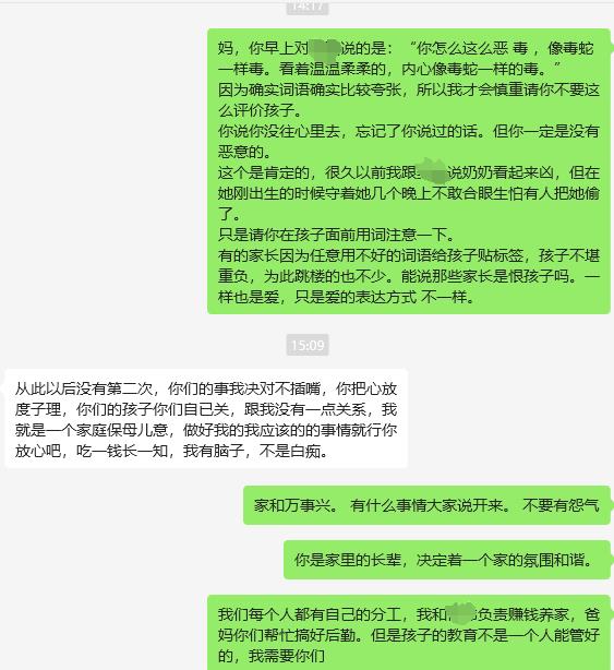 如果你们是孩子的长辈,你们会怎么反应呢?我洗碗的时候听到这话有点发愣啊,我反应慢啊。我就在琢磨着我是不是要冲出去制止奶奶的攻击啊,但我又害怕奶奶呀,哦,就我婆婆。 我怕她炸起来,因为我是她讨厌的对象嘛,我说话不是火上浇油嘛,我又想着儿子前天批评我说以前骂过奶奶,我就想着以后指出奶奶语言不当之处是不是要背着孩子指出,免得奶奶生气我们又大声辩论起来让孩子看到不好。