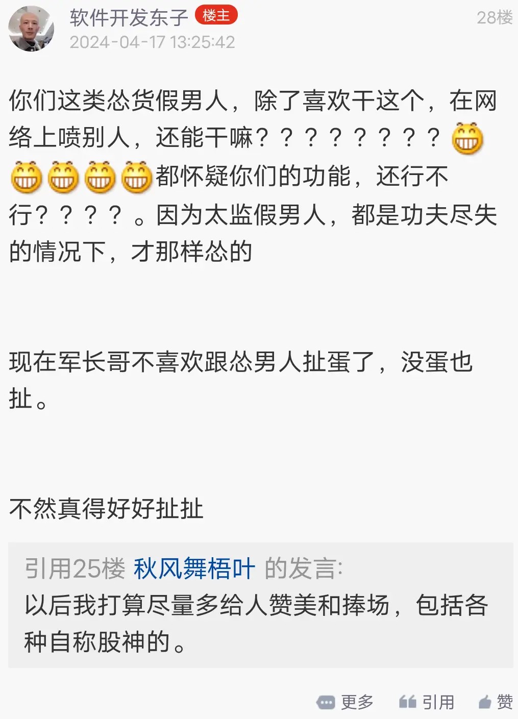 免得他们再骂你呀。引用25楼最爱我的儿子的发言:知三当三,专业骗人的烂渣,是不会有道德的,