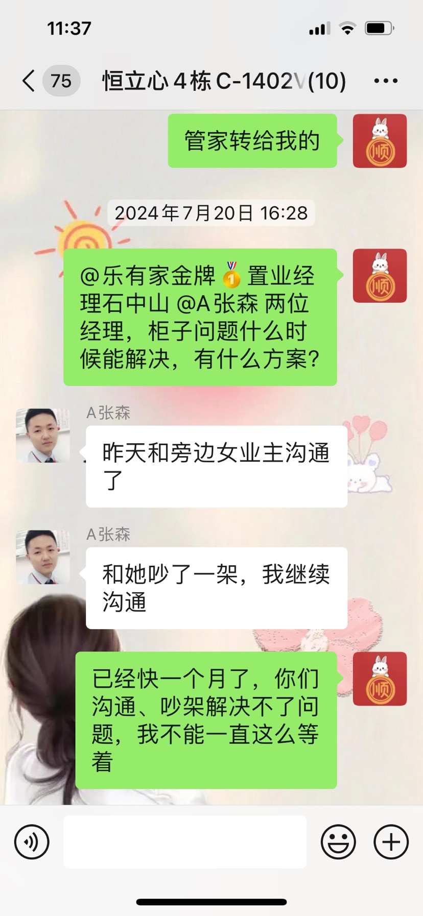 然而,在房屋交易完成后,1401业主却坚称乐有家中介从未告知其无鞋柜使用权,并强行占用一半鞋柜。当我多次联系张森经理寻求解决方案时,他却表示无能为力,仅提出补偿我5000元草草了事。