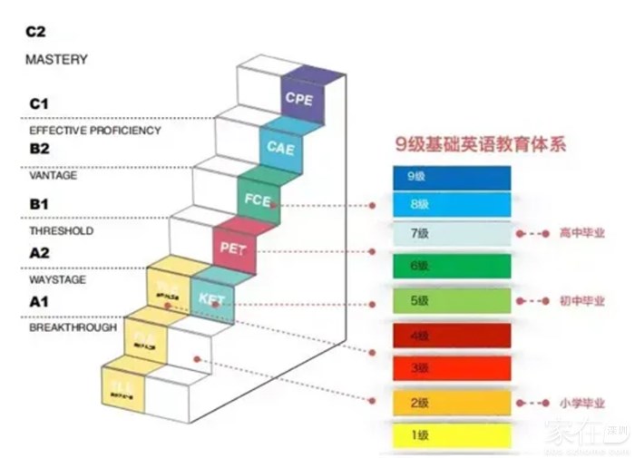 这套考试体系和国内公立学校的英语体系不一样,如果从词汇量、考试深度来粗略对应的话: