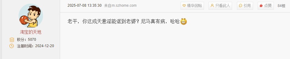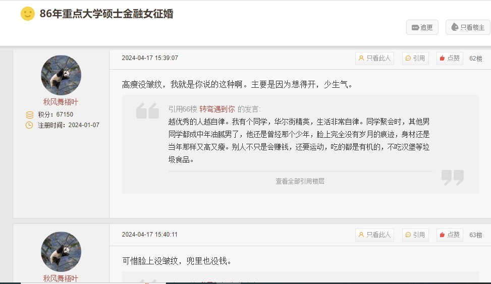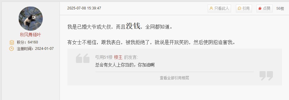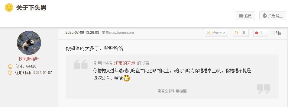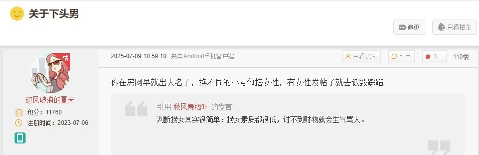 引用97楼楼主的发言:只要有女性的情感贴子,或者高知女性的征婚贴子,秋风舞梧叶就像打了鸡血一样癫狂。50多岁的人,看看他的丑恶嘴脸,这样的畜生,够不够恶心!