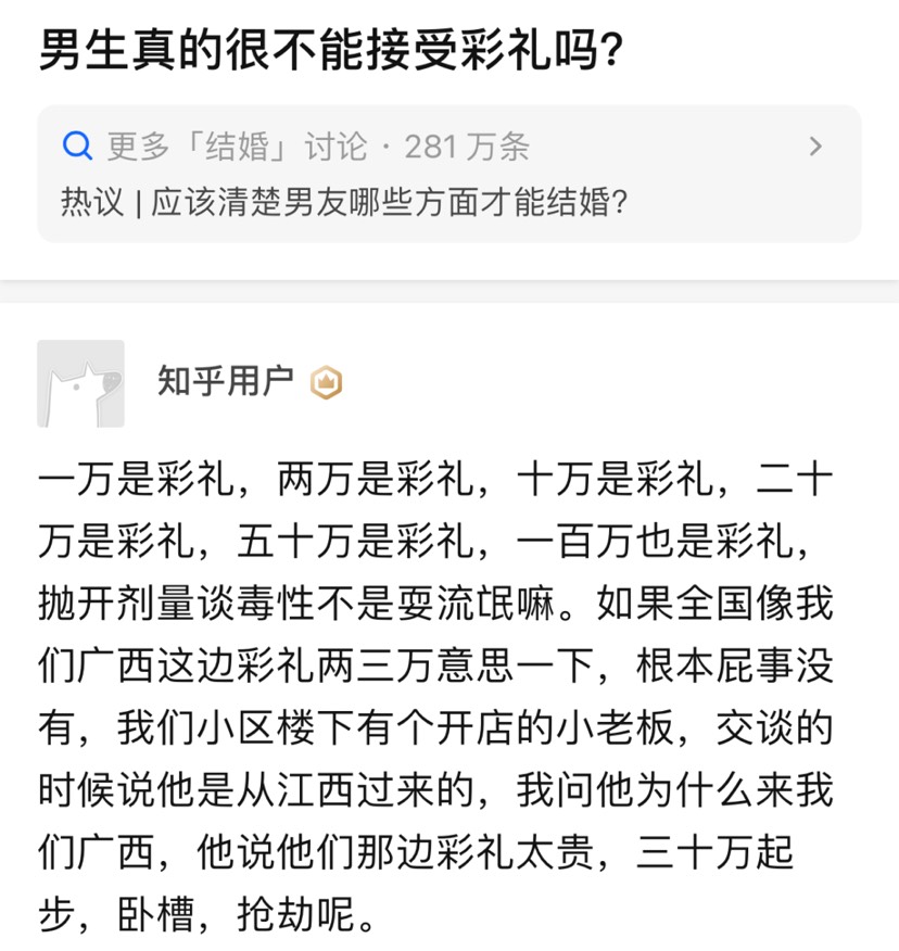 首先,彩礼是一个地方的风俗。其次,在生育保障生育要求和婚姻法不够与时俱进时,适当的彩礼是可以的。另外,高价彩礼下对应的是催婚催生,如果谁家有孩子很大年龄没有结婚,其父母或者孩子都会受到很多人刻意的质疑和恶意。引用2楼最爱我的儿子的发言:我们有一个群体,根本不说彩礼,在我们那个院子里,谁家的姑娘说彩礼,会被全大院耻笑,