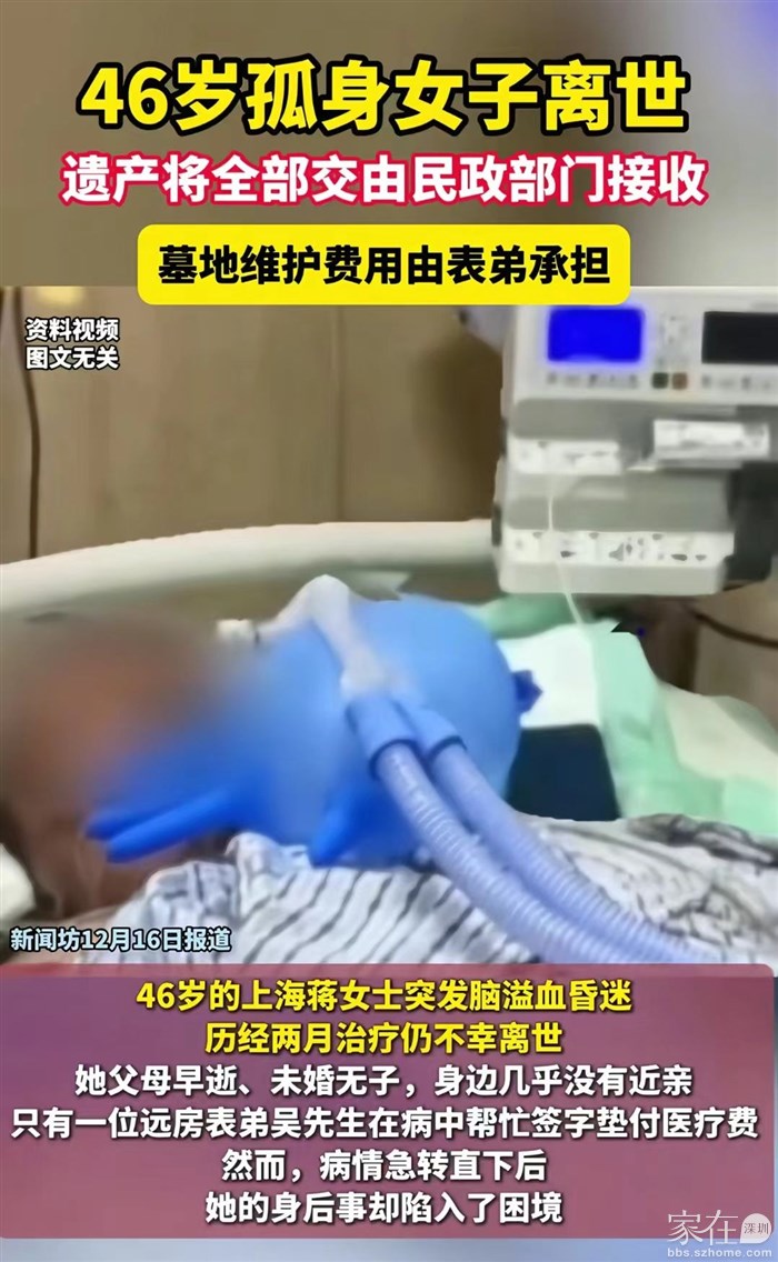 引用kindofSeptember的发言:不是这样子的,女的是有不少遗产的,她的表弟申请拿出一部分用来给她办纪念会和买墓地,民政局找借口不同意。凭啥不同意,就只会接管别人的遗产,后事不管?你可以看新闻,这个表弟很好了,治病的时候还和公司一起垫付了钱,其实女的有钱,但是她昏迷了,银行不给表弟取钱。这件事完全是有关部门吃相太难看。引用4楼轻装回归2的发言:这。。。原来孤独不一定终老,还会终死的。