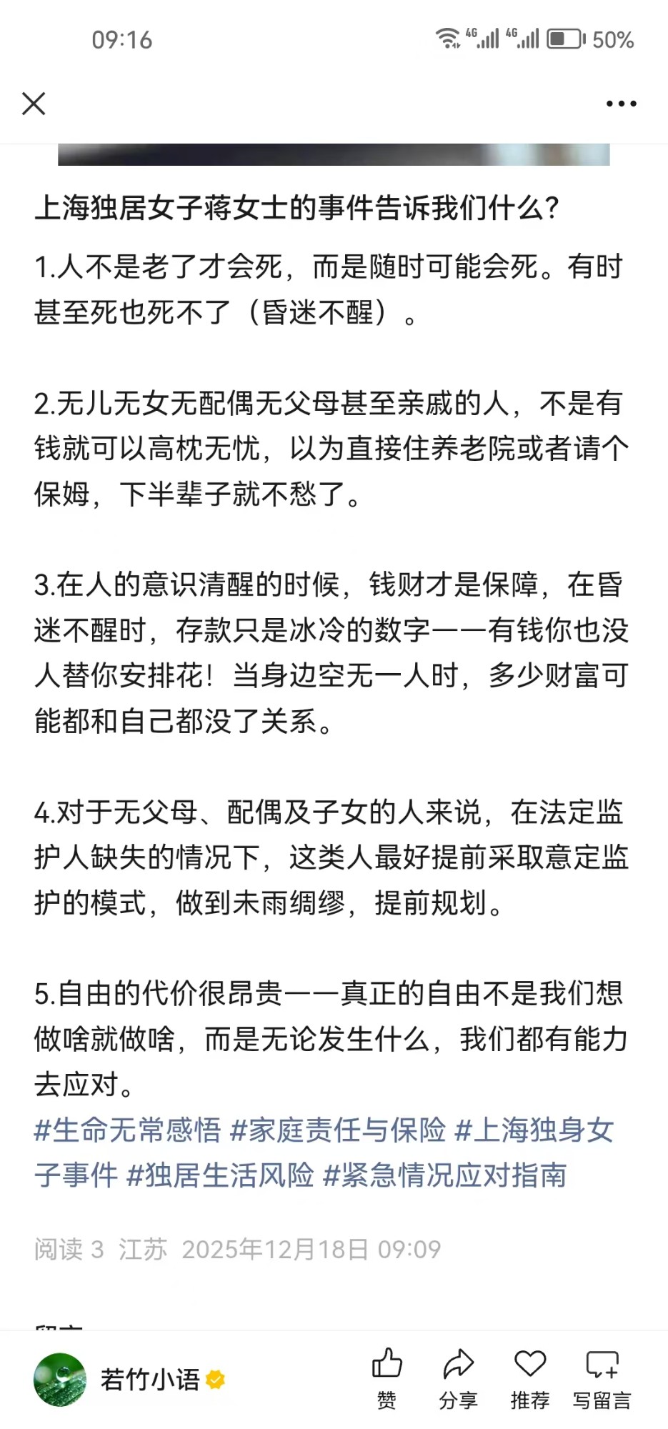 引用6楼嗯好多了的发言:没有密码,人还有气,取她钱到时不认会是银行的责任。先交待好就不会这么麻烦。引用kindofSeptember的发言:不是这样子的,女的是有不少遗产的,她的表弟申请拿出一部分用来给她办纪念会和买墓地,民政局找借口不同意。凭啥不同意,就只会接管别人的遗产,后事不管?你可以看新闻,这个表弟很好了,治病的时候还和公司一起垫付了钱,其实女的有钱,但是她昏迷了,银行不给表弟取钱。这件事完全是有关部门吃相太难看。引用4楼轻装回归2的发言:这。。。原来孤独不一定终老,还会终死的。
