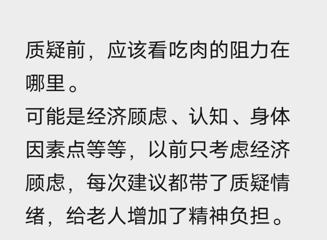 我不能用父母对我的方法建议他们吃肉,负建议反而增加他们纠偏的阻力。我试试揣摩他们在意什么,从他们在意的事情上入手,