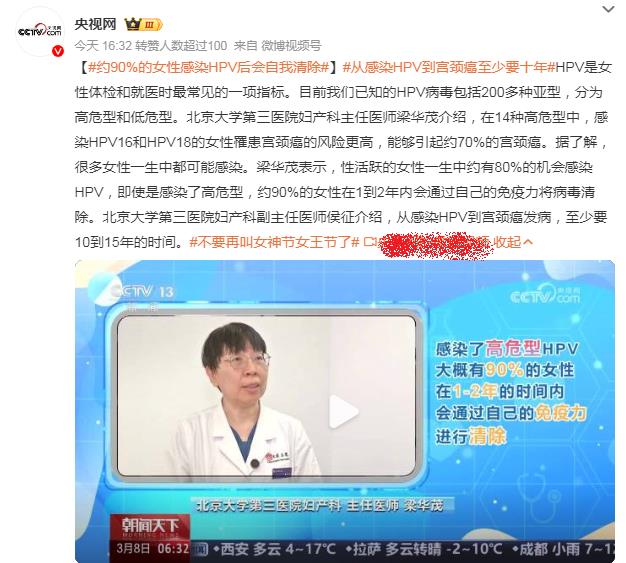 约90%女性感染HPV后会自动清除,感染HPV到宫颈癌至少要10年