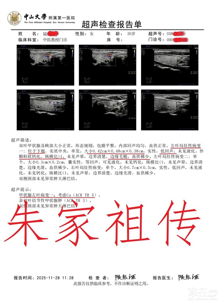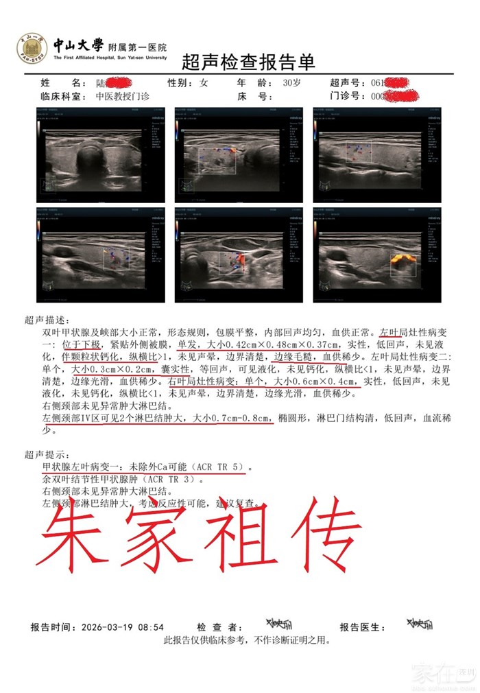 这是中山一院专家介绍的甲状腺结节5类,疑Ca,来求医【朱家祖传】本草麦粒灸调理的患者。