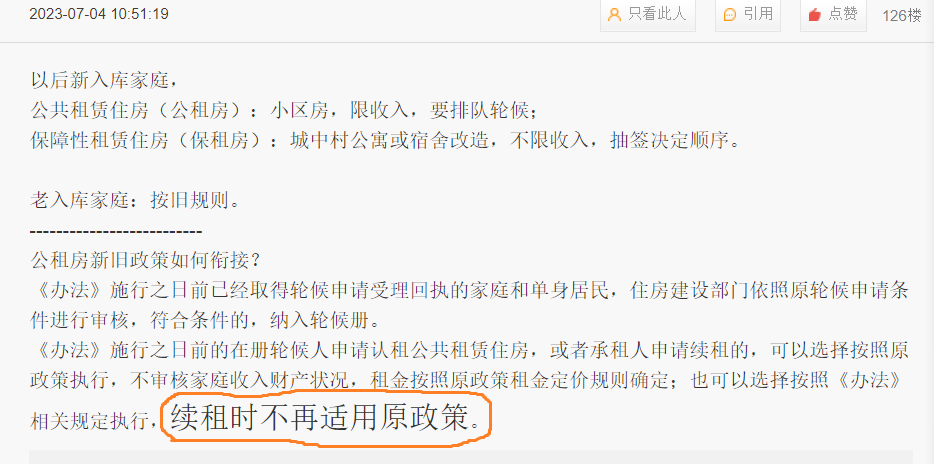 想永远不变,是不可能滴引用5楼rikqqsky的发言:大哥你语文没学好 两段话中间是分号,意思是分两种情况 第一: 选择按老政策就一直下去 第二:如果自己选了新政策,那么续租时就要审核引用霸主1987的发言:续租的问题,老人老办法是因为你的租房合同没有到期,就继续租,租房合同到期了,肯定用新政策下的租房合同了。租的房子不要太乐观,人无远虑,必有近忧,早做打算。引用2楼Liris4941821_微信的发言:
