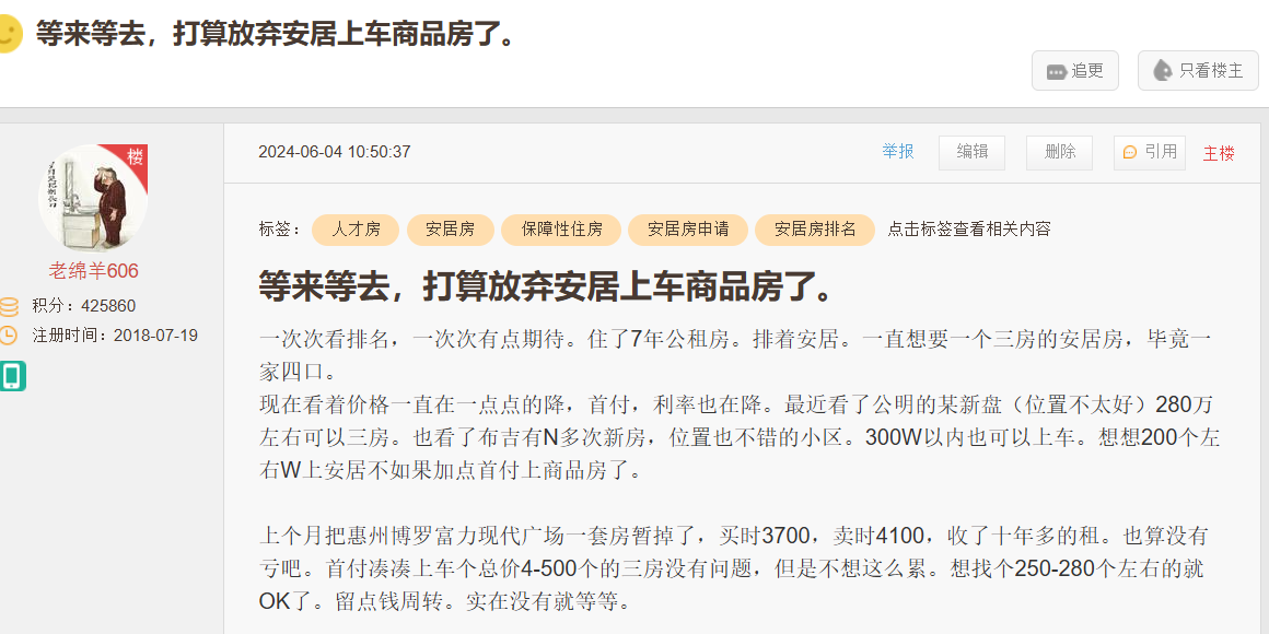 引用1楼szbody的发言:我排10年了,1字开头的老妖,这么多年一直在关注,总体来说,周边商品房降价也没见安居房降价,公摊面积也大,实用面积小,大多是深圳周边的边角料,不是偏就是各种交通不便,周比当今所住周边的二手房价,安居房的优势淡了,近期我也在考虑商品房。
