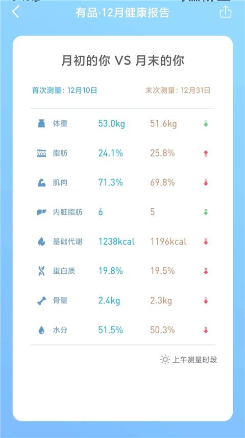 引用kobe_2008的发言:体重下降,掉肌肉增脂肪?引用15楼楼主的发言:#在老家#这次回家亲戚们多了一个话题:中招新冠后的身体反应。说一定要坐一个月的月子,七大姑八大姨集体批判我不该那么早就跑步。我是12.23号核酸阳性,当天还跑了10k,然后锻炼中断,一直到元旦开始恢复运动。8天没有任何运动,数据就哗啦啦的往下掉。想跑就跑,自己的身体自己知道。家里的猫,电饭煲里暖和