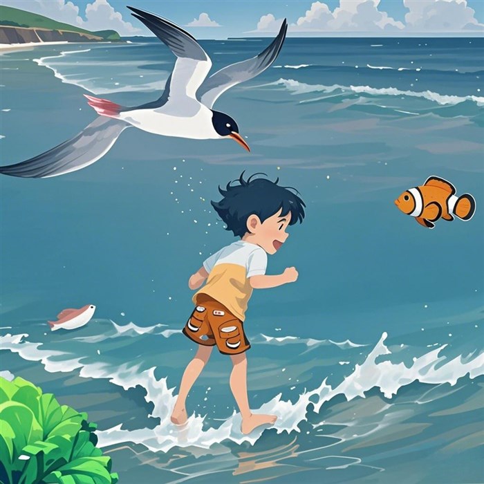 “啪嗒!” 渔网吓得掉进浪里,小丑鱼哧溜钻出水面:“朋友!我就知道你会来——看!我发明了逃生舞步!”