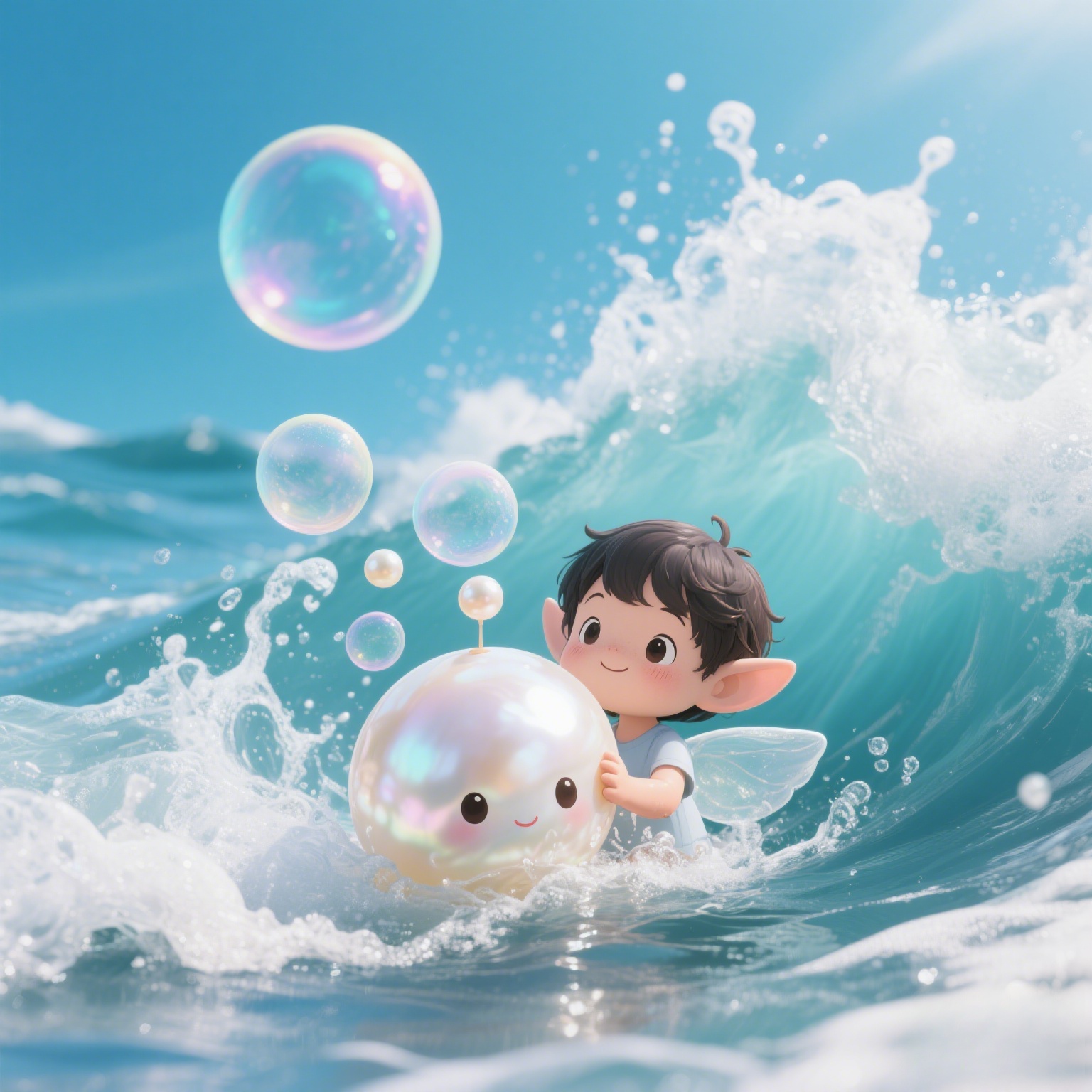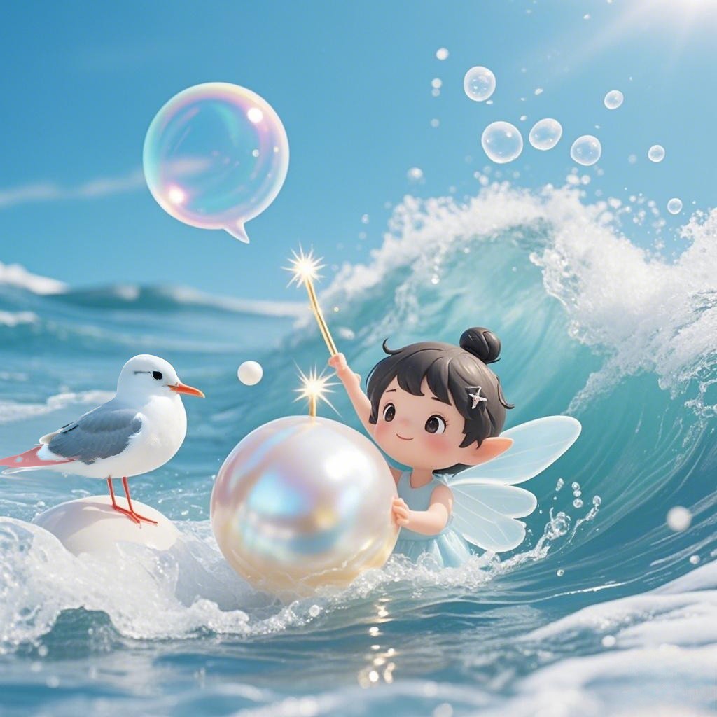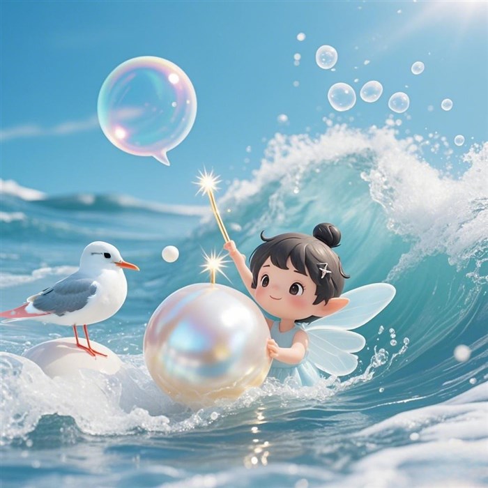 浪花里钻出个珍珠小精灵,"善良的孩子会得到三颗愿望泡泡哟~"