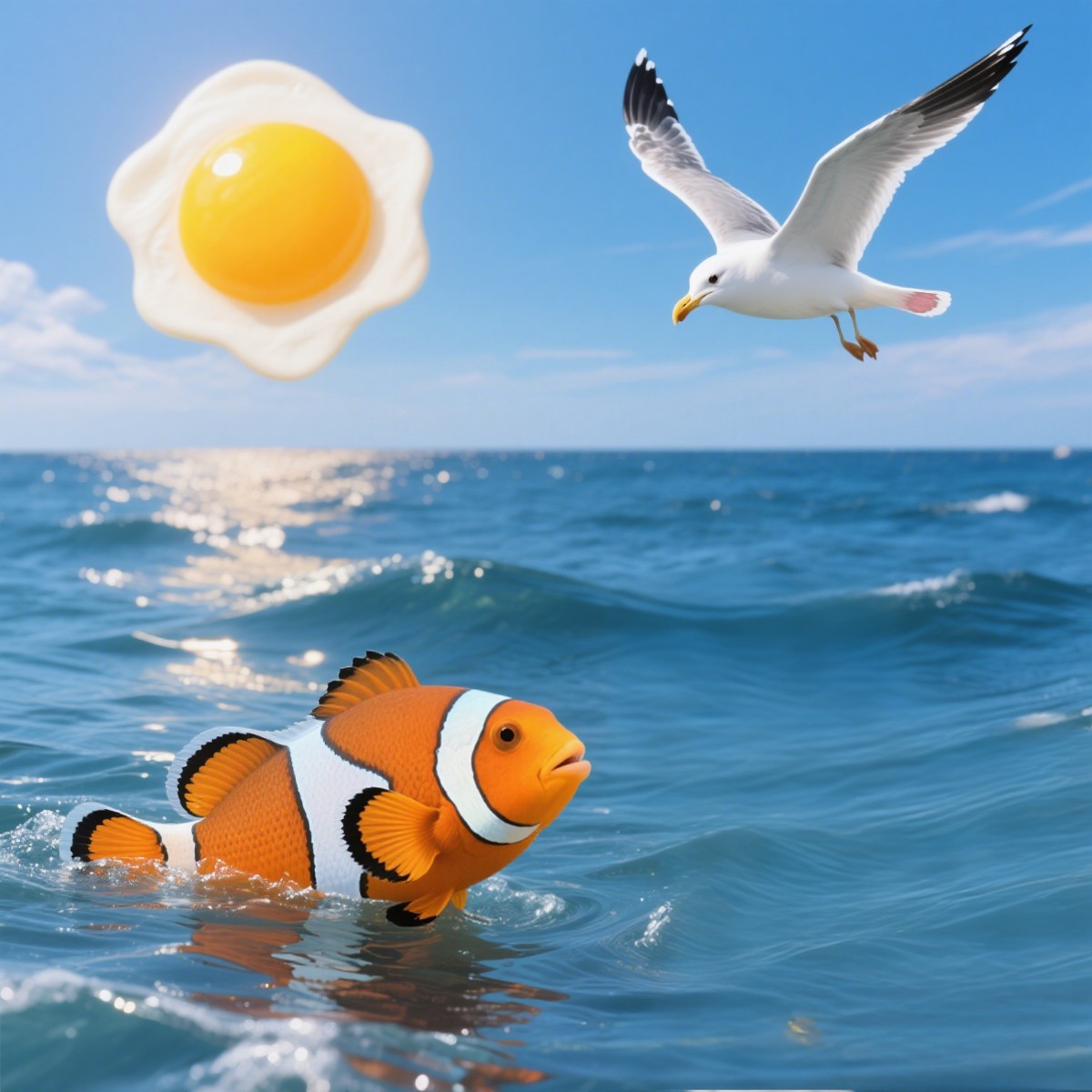 小丑鱼惊得吐出一串气泡:“早、早!看这阳光…… 像烤熟的蛋黄!”