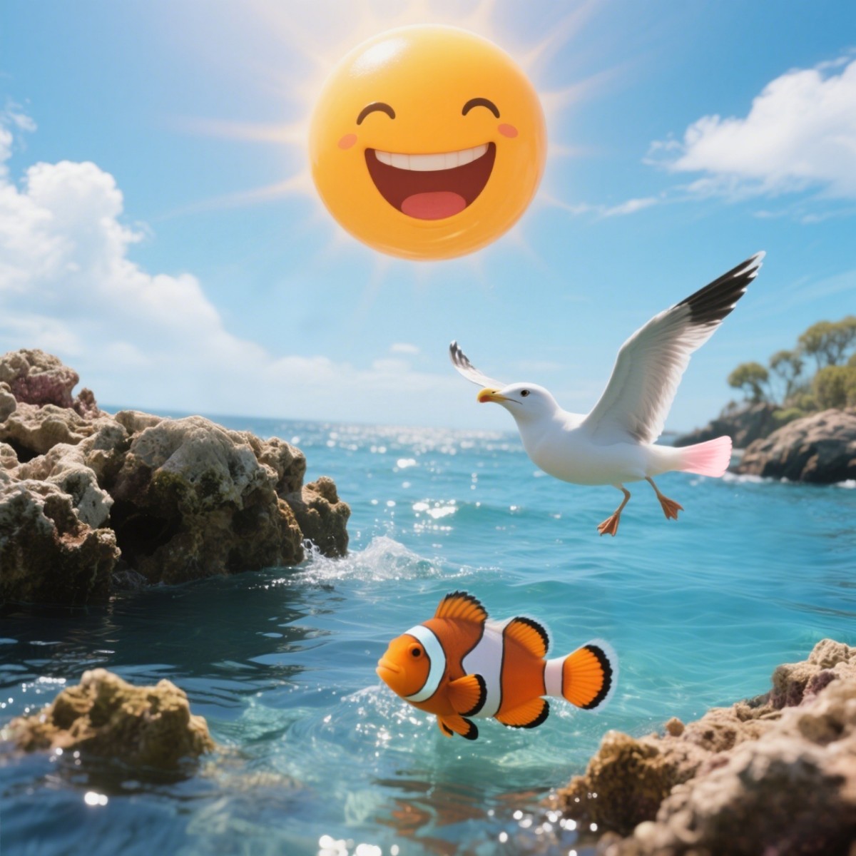 噗噜噜!海里跳出一条小丑鱼,扭着橘色条纹肚皮转圈圈,“朋友!我是会跳扭扭舞的彩虹糖!”